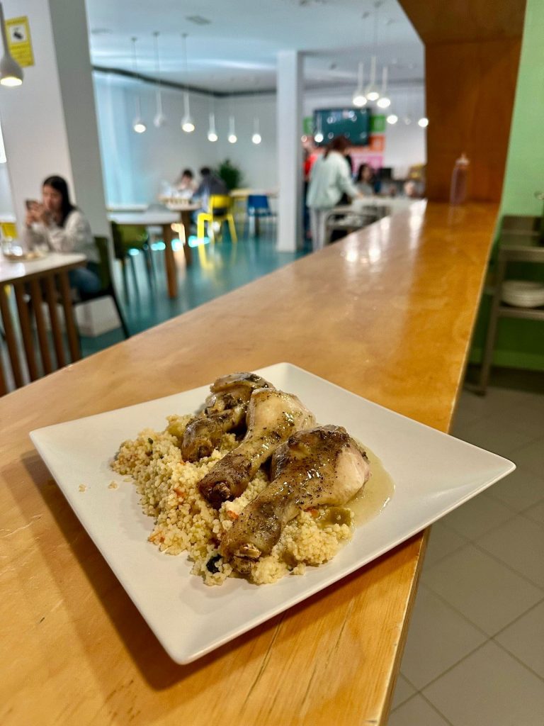 Merluza o pez espada con arroz o ensalada.